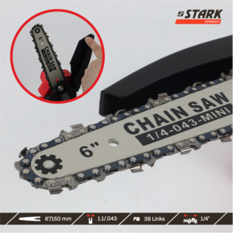 - Комплектується пиляльною шиною довжиною 6” або 150 мм та ланцюгом з кроком 1/4”. Кількість ланок – 37. Ширина паза у шині – 1,1 мм /.043.