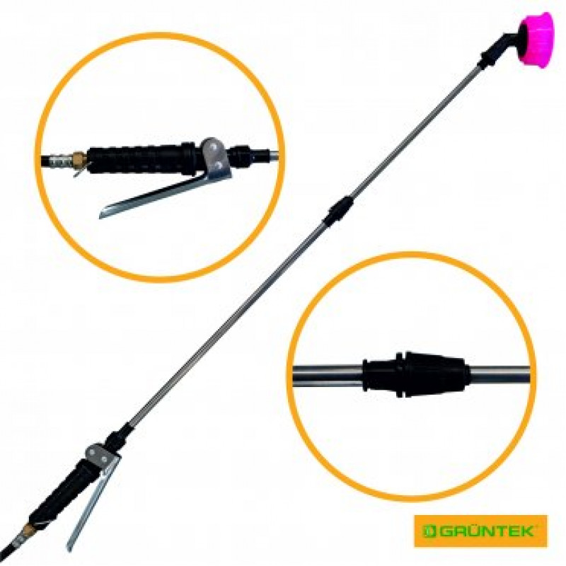 - Комплектується довгою металевою штангою з подвійною форсункою для розпилення робочої рідини.