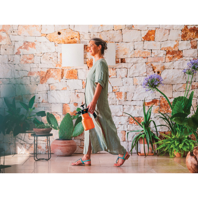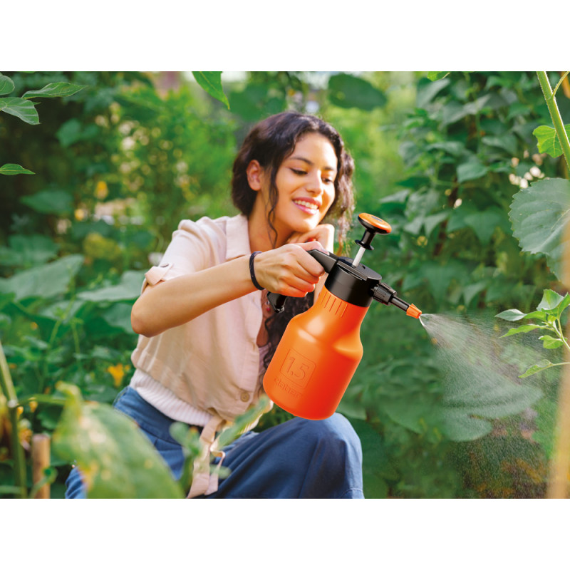 Обприскувач під тиском 1,5 л. Сумісний з водою та іншими розчинами, такими як миючі засоби, добрива, фунгіциди, протипаразитарні засоби та засоби для знищення бур'янів. Зручна прозора смужка для перевірки рівня рідини всередині. Алюмінієвий вал і поршень з регульованою кільцевою гайкою для позначення розчину, що міститься в баку. Задня кнопка для безперервного розпилення з механізмом блокування. Запобіжний клапан для тиску вище 3 бар і кнопка вентиляції, щоб скинути тиск і полегшити відкриття контейнера. Регульована насадка. Використовуйте всі 360° завдяки зручному фільтру з вагою. Хімічно стійкі ущільнення Viton® для максимальної довговічності.