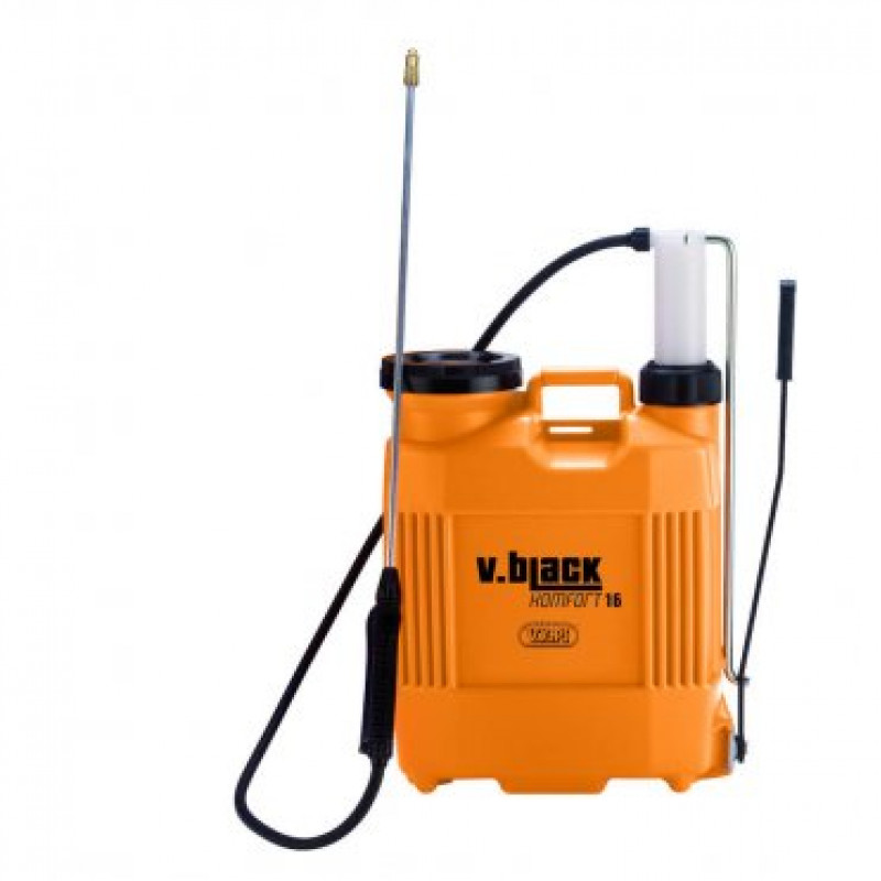 Обприскувач VOLPI-V-BLACK KOMFORT 16 л – практичний інструмент для розпилення різних хімічних розчинів (лікувальних, захисних розчинів, добрив, гербіцидів тощо). Модель працює за допомогою вбудованої ручної помпи для створення робочого тиску в баку.