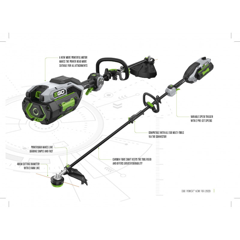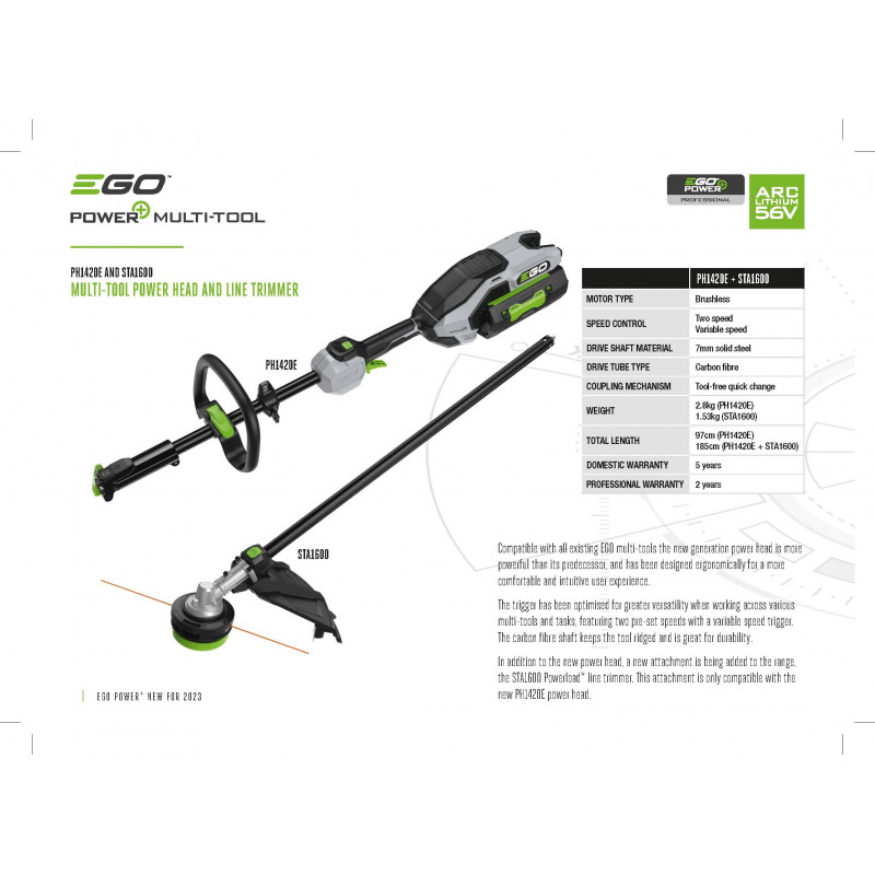 EGO PH1420E - нове покоління універсальних мультифункціональних інструментів (комбісистем) для вирішення всього спектра завдань у саду та дачній ділянці. Конструкція отримала значні поліпшення, завдяки яким збільшилася продуктивність і міцність. Залежно від підключеної насадки, комбісистема виконує роль тримера, кущоріза або культиватора. Високу потужність та продуктивність забезпечує безщітковий двигун, який живиться від Li-ion акумуляторів EGO 56V. Інструмент має регулятор швидкості, що дозволяє підлаштуватися під завдання будь-якої складності.