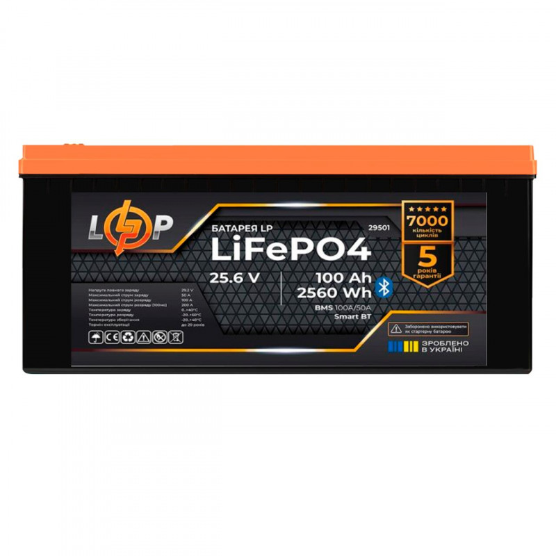 Акумулятор LP LiFePO4 25,6V - 100 Ah (2560Wh) (BMS 100A/50А) пластик Smart BT