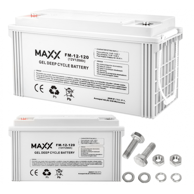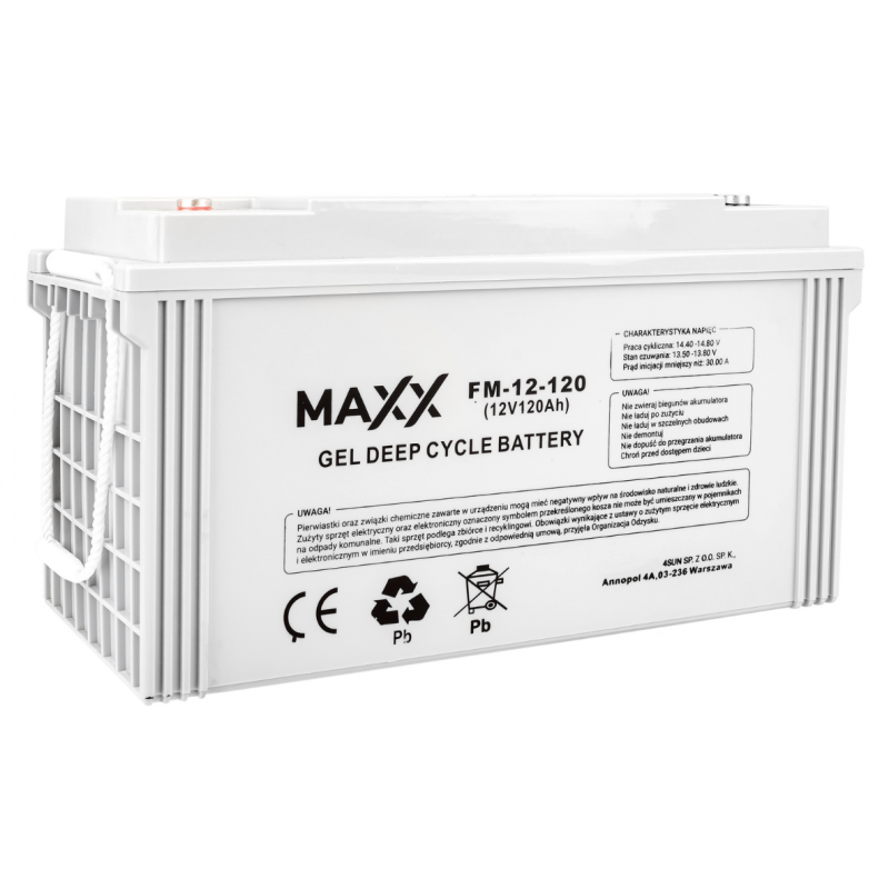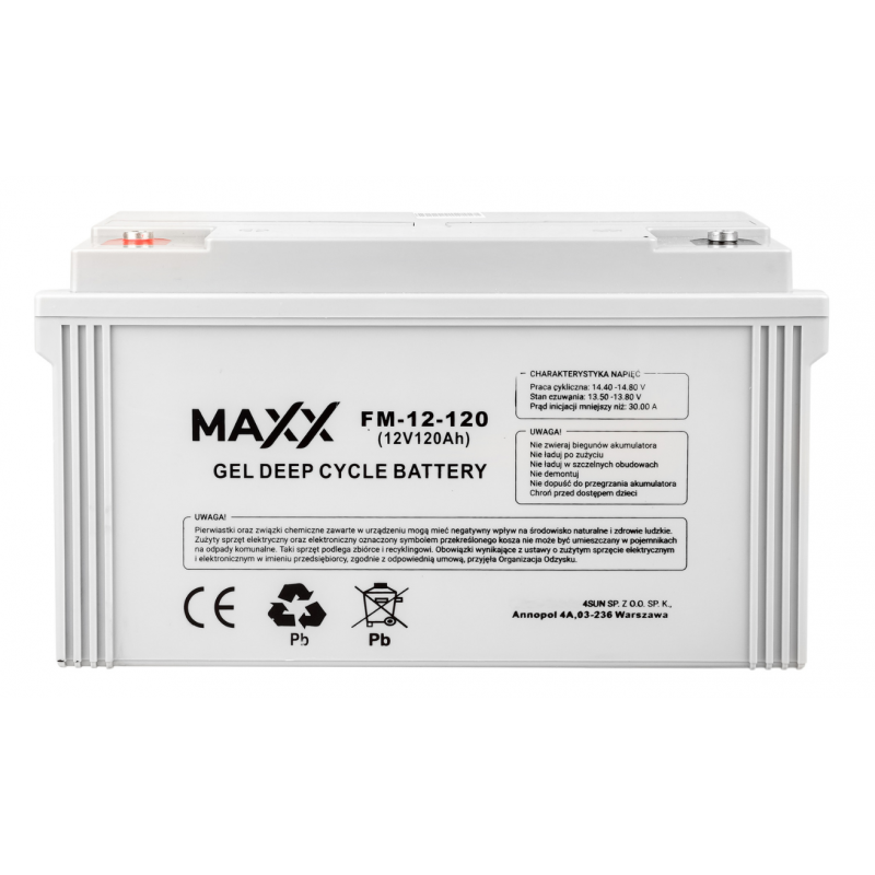 Гелевий акумулятор DEEP CYCLE MAXX 120Ач 12В 4SUN Акумулятори виготовлені за технологією DEEP CYCLE і в основному призначені для використання в системах аварійного електропостачання (ДБЖ, системи автоматизації), сонячних установках та перетворювачах напруги. Найкраще вони працюють у системах буферної зарядки, але їх також можна використовувати у додатках, де батареї працюють циклічно. Вони характеризуються високою стійкістю до глибоких розрядів. Для глибини розряду до 50% вони мають близько 650 робочих циклів. Вони дуже добре поглинають гази. Розрахунковий термін служби 8-10 років за 20-25°С. Вони не вимагають доливання або заміни електроліту. Вони можуть працювати у будь-якому положенні Вони характеризуються високою ефективністю та продуктивністю. Висока стійкість до механічних пошкоджень та високих температур Безпечно використовувати – акумулятор щільно закритий і не протікає.