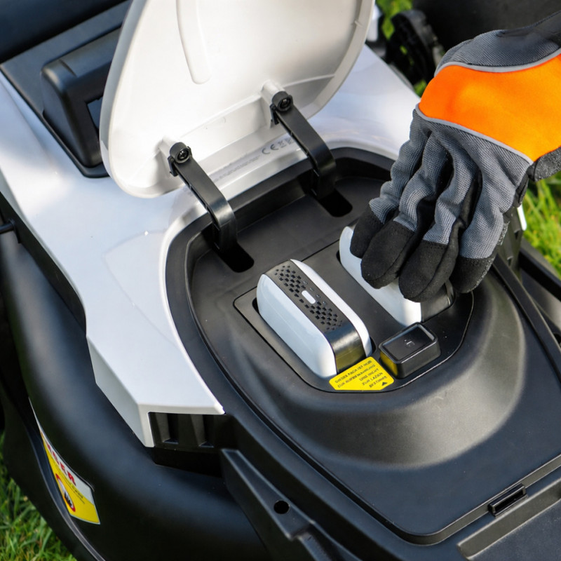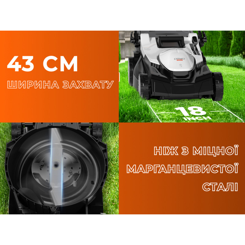 - Висока продуктивність. Ширина захвату складає 43 см, що дає змогу покривати значну площу за меншу кількість проходів. Ніж, виготовлений із міцної марганцевистої сталі, стійкий до зносу та забезпечує чистий зріз трави.