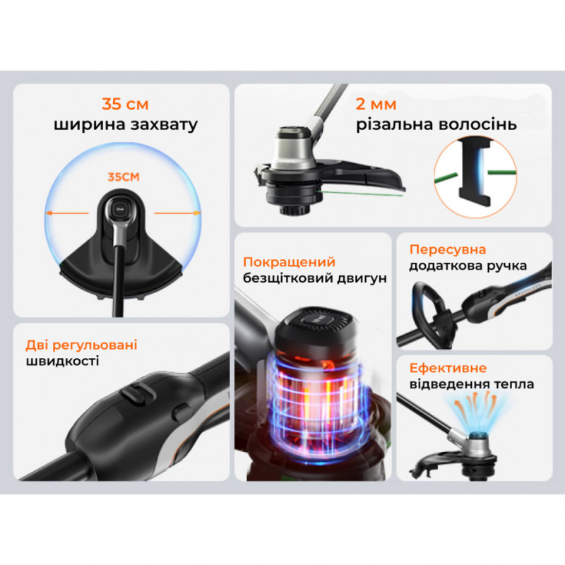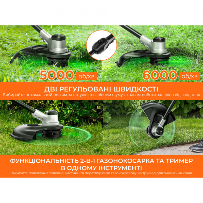 Вага пристрою без батарей становить лише 3 кг, що робить його дуже легким у керуванні. Ви можете обирати одну з двох швидкостей: економну (5000 об/хв) для звичайної трави або максимальну (6000 об/хв) для товстих бур'янів.