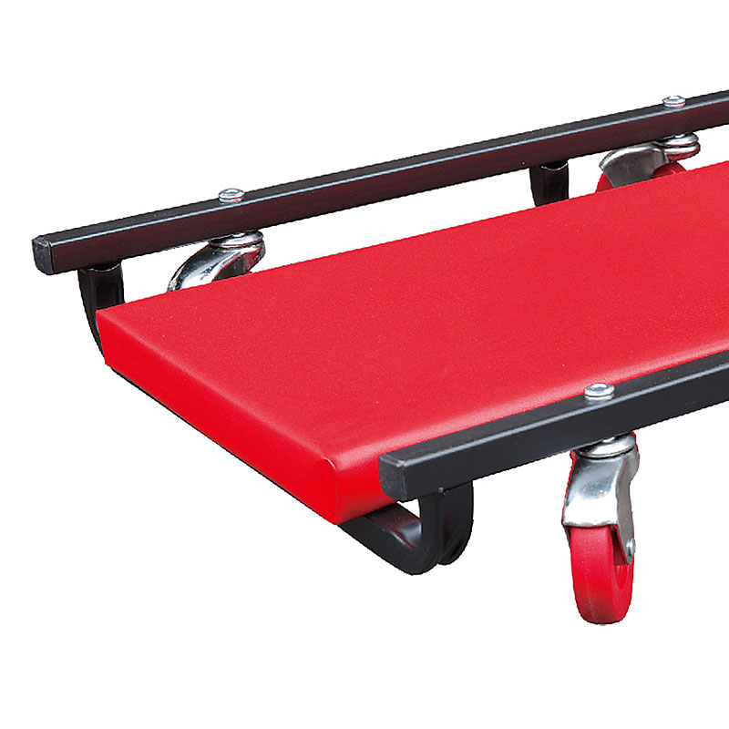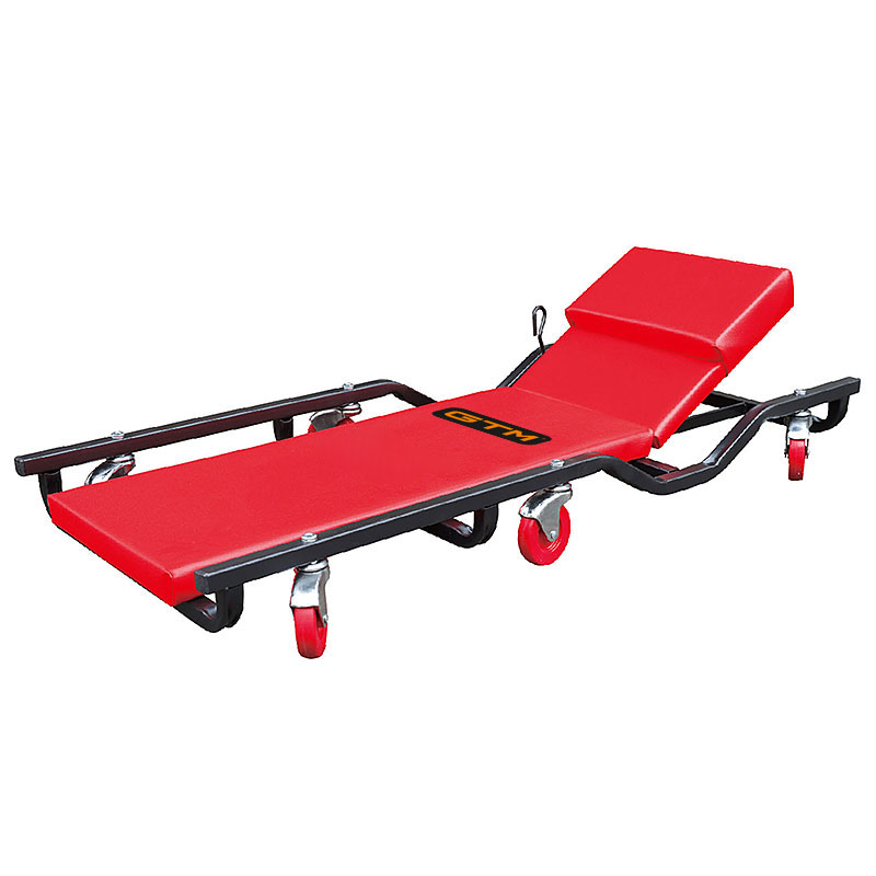Лежак автослюсаря підкатний з відкидним підголовником GTM TRH6455 має посилений сталевий каркас з квадратного металевого профілю, покриття - порошкове. Матеріал поверхні - мастилостійкий вініл, а товста пінопластова прокладка забезпечує комфорт майстра під час роботи.