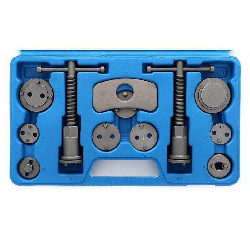У комплект входять два преси (правий і лівий торсійні), дві балки для притиску преса до сідла затискача і широкий вибір перехідників. Точна підгонка перехідника і поршня є запорукою правильного введення поршня в циліндр гальмівного супорта. Це, в свою чергу, захищає механіку від заклинювання і заїдання поршня в циліндрі. Ручка оснащена магнітним наконечником, завдяки якому утримує на осі пластину, відповідну даному поршню. Набір рекомендований для загальномеханічних автосервісів, відмінно працює при роботі з керамічними поршнями.