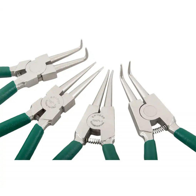 Цей професійний набір кліщів призначений для зняття та встановлення внутрішніх і зовнішніх стопорних кілець. Виготовлений із високоміцної армованої сталі та відповідає німецьким стандартам якості DIN 471 і DIN 472, що гарантує точність і довговічність інструменту.