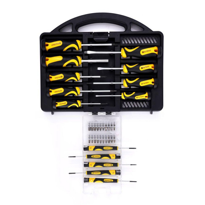 Набір викруток та бітів TAGRED TA1135, 34 шт - виготовлений з високоякісних матеріалів, включаючи хром-ванадієву сталь, а ручки - з міцного пластику з м'яким покриттям, яке запобігає ковзанню інструментів у руці! Великі та м'які ручки дозволяють створювати більший крутний момент для полегшення закручування. Чітке маркування на ручці полегшує вибір насадки для використання. Всі компоненти виготовлені за найвищими стандартами і поміщені в дуже міцний і практичний кейс.