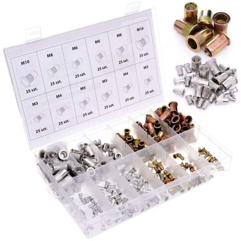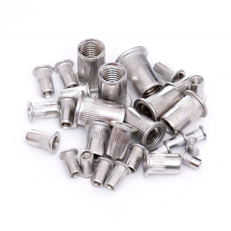 Сталеві та алюмінієві заклепки, 300 шт TAGRED TA4093 - мають циліндричний рифлений фланець, завдяки чому вони більш щільно прилягають. Заклепки дозволяють вкручувати гвинт або болт з метричною різьбою в листовий метал або інші матеріали, де неможливо зробити різьбу.