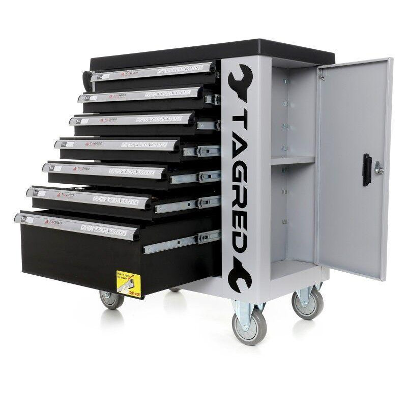 Візок для майстерні з інструментами TAGRED TA212 з надзвичайно міцною і зручною конструкцією та 251 професійним інструментом з хромванадієвої сталі відмінно підходить для професійних автомайстерень. Інструмент компактно розміщений у 6 ящиках, оснащених напрямними з шарикопідшипниковим механізмом. 7 ящик пустий, призначений для зберігання додаткового обладнання та аксесуарів. Візок обладнаний центральною системою замикання, також кожен ящик має індивідуальний замок.