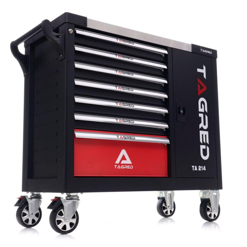 Візок для майстерні з інструментами TAGRED TA214, 298 ел - дозволяє підтримувати порядок на робочому місці та захищає інструменти від крадіжки (візок закривається на ключ). Візок має ергономічні ручки, інтегровані з верхом, і повністю висувні ящики на підшипниках. Центральний замок з двома ключами, що закривають усі ящики, а також подвійні стінки та замок для ящиків. Візок оснащений 4 колесами, включаючи 2 поворотних колеса, що робить її дуже зручною для транспортування. Стільниця універсальна перфорована (з поліпропілену). Тріскачки виготовлені з хромованадієвої сталі CrV6140.