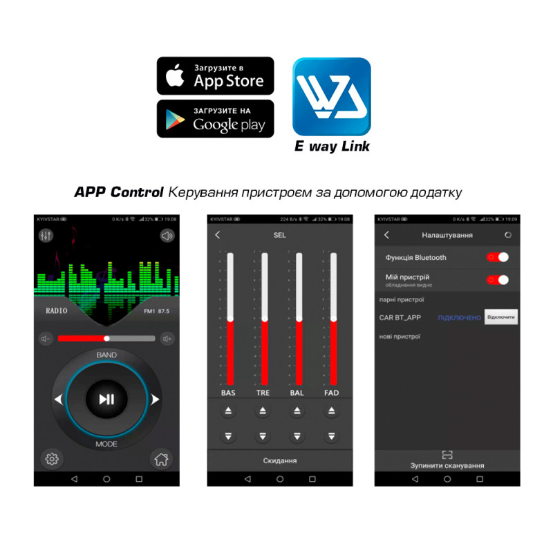 Магнітола 1 Din з можливістю керуванням через мобільний додаток EwayLink (Android / IOS), перемикання між джерелами сигналу, настройка звукових параметрів і т.д.