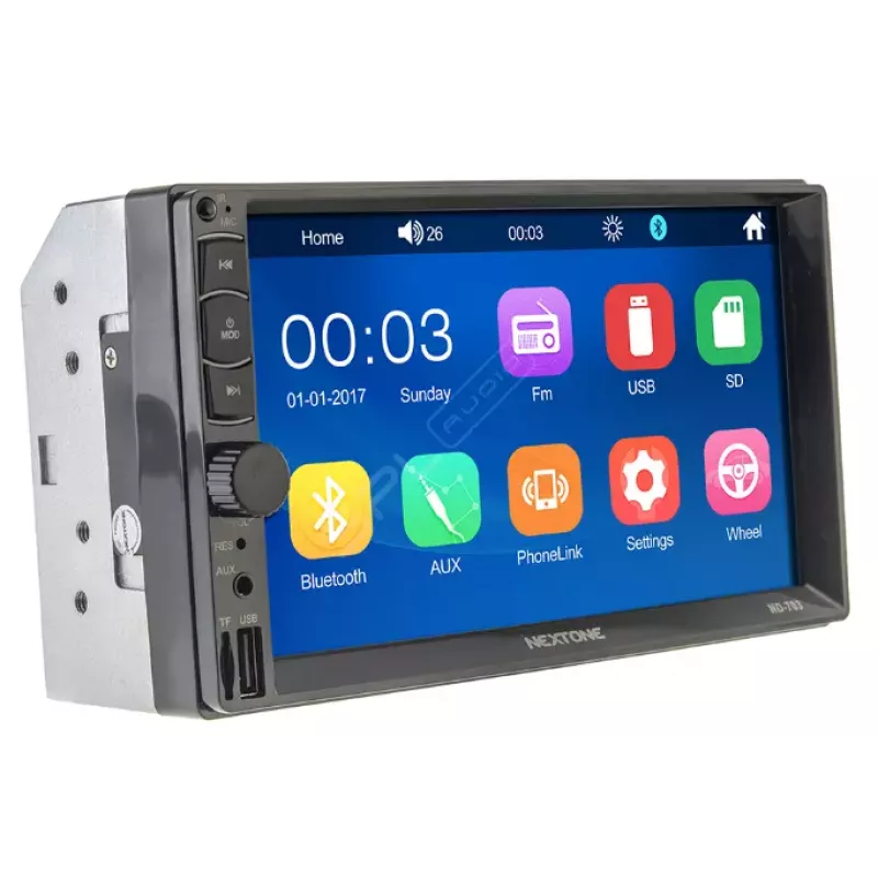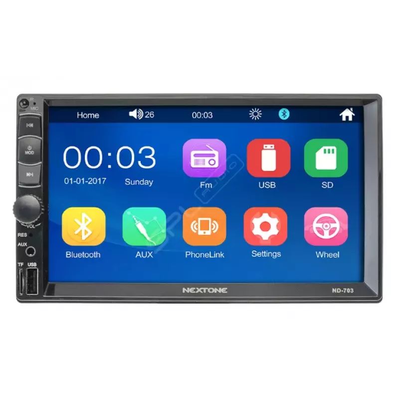 Універсальна 2DIN мультимедійна станція Nextone MD-703 на операційній системі Wince 6.0, Укорочений корпус, Мультимовне меню, 7″ TFT дисплей, Регулювання яскравості, контрастності, кольоровості дисплея, Висока вихідна потужність (4 х 45 Вт), Модуль Вбудований мікрофон, Змінюване підсвічування кнопок, Відтворення аудіо, відео, фото з USB і microSD.
