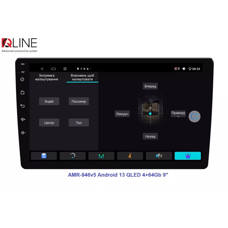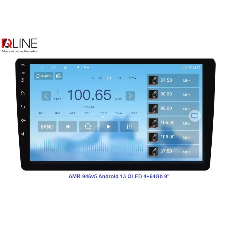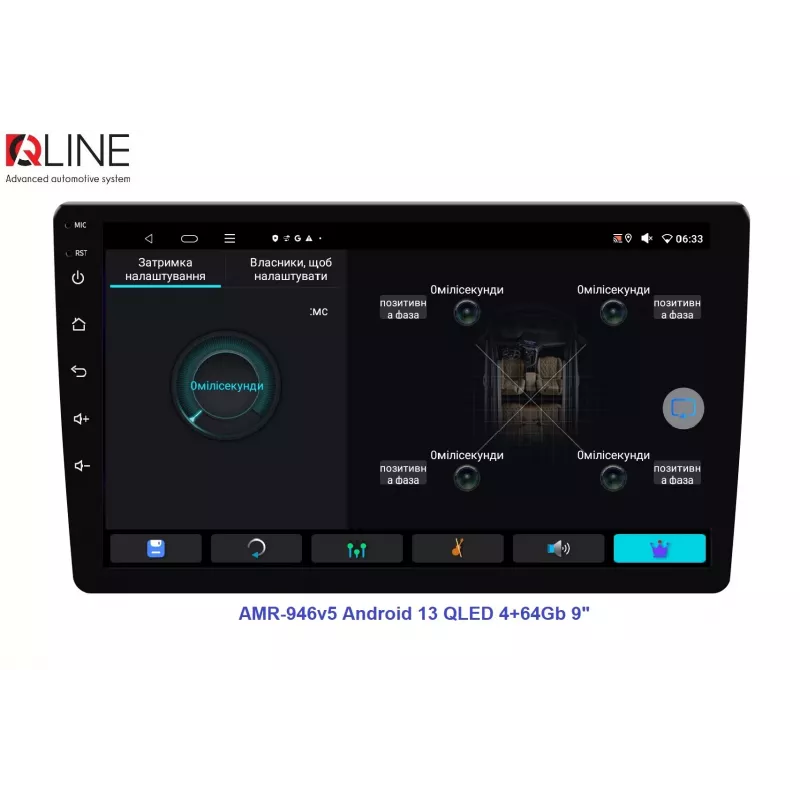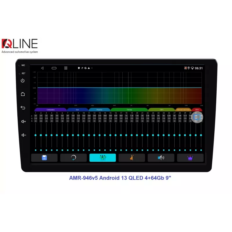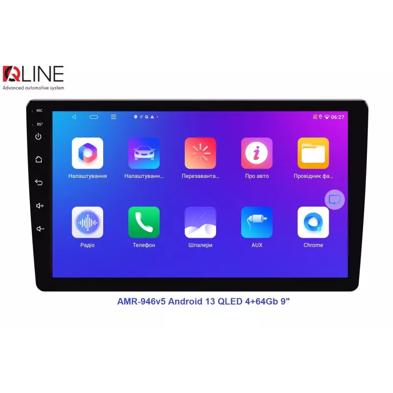 Як видно з назви, новинка має 4/64 Гб пам'яті, 9" екран та OS Android 13 як і попередня версія, але решта функціоналу дуже змінилась. Qline AMR-946v5 отримала яскравий QLED екран 1280*720, популярний та надійний процесор Allwinner A133P 1.8GHz, потужний підсилювач TCB001, радіомодуль SI4755 з покращеним прийомом радіо та RDS, високофункціональний DSP процесор AKM7604, Bluetooth 5.4 і головне - підтримку кругового огляду.