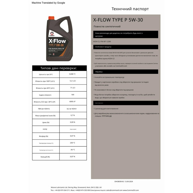 Повністю синтетичне масло 5W-30 з низьким рівнем сульфатної зольності та низьким вмістом фосфору та сірки для сучасних бензинових та дизельних двигунів з пристроями доочищення вихлопних газів, що потребують рівня ACEA C2.