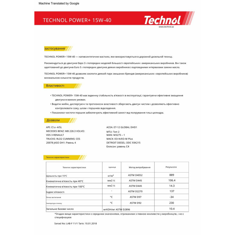 Technol Power Plus 15W-40 – моторне масло, розроблене з метою задоволення вимог вантажних автомобілів, оснащених дизельним двигуном. Це моторне масло за рахунок високоякісного базового масла і присадок забезпечує відмінну стабільність в'язкості, що забезпечує ефективне змащування у важких робочих умовах завдяки своїм миючим, розподільним і протизносним властивостям, підтримує двигун в чистоті, захищає його рухомі частини і зменшує утворення відкладень. Ця моторна олія рекомендується для використання в двигунах Євро 3 та попередніх поколінь більшості американських та європейських виробників. Ця олія також адаптована для використання в двигунах Euro 5 та попередніх поколінь деяких інших виробників.