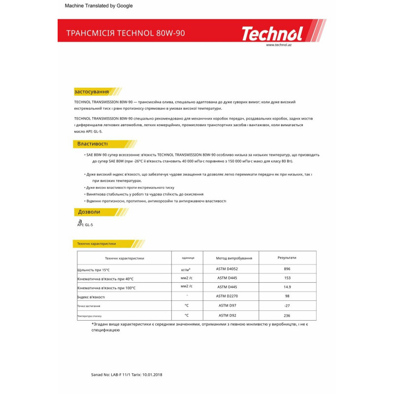 Technol Gear Oil 80W-90 GL-5 це трансмісійна олія для екстермальних тисків, вироблена з використанням добірних високоякісних мінеральних базових масел для задоволення суворих вимог до механічних коробок передач, роздавальних коробок, задніх мостів та диференціалів легкових для яких потрібно API GL-5. Високий індекс в'язкості забезпечує відмінне змащення компонентів зубчастої передачі, що рухаються, і покращує перемикання передач при дуже низьких і дуже високих температурах, а висока термостійкість забезпечує захист від утворення відкладень. Має чудові антиоксидантні, протизносні, протипінні, антикорозійні та несучі властивості.