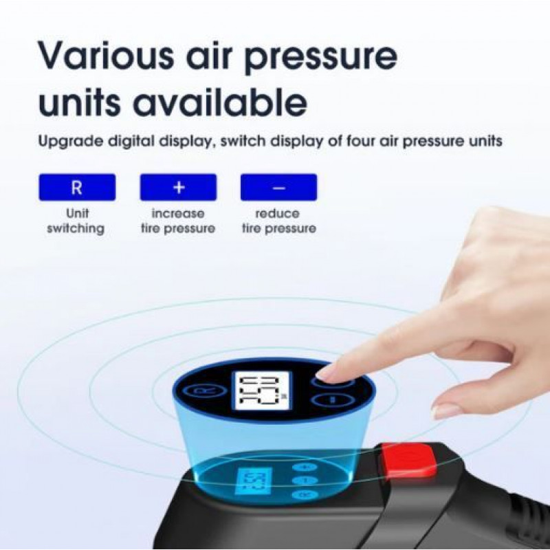 Програмована інструкція щодо використання: натисніть кнопку «R», щоб встановити бажану одиницю тиску, а потім натисніть кнопки «+» та «-», щоб встановити потрібний тиск. Повітряний компресор автоматично вимкнеться, коли він досягне попередньо встановленого тиску (будь ласка, переконайтеся, що встановлений тиск вищий за поточний тиск вашої шини).