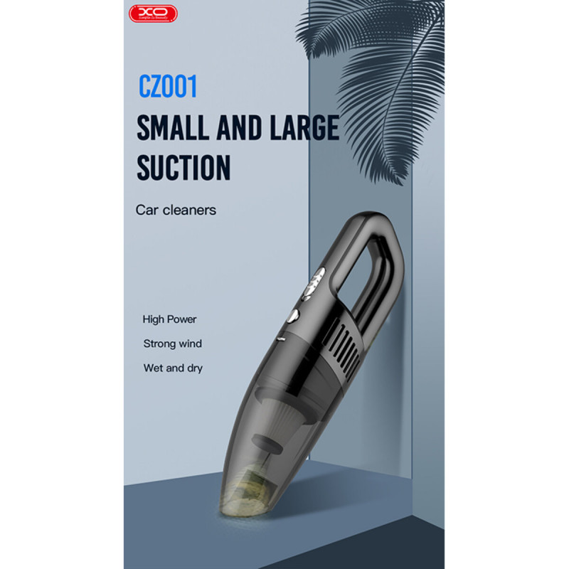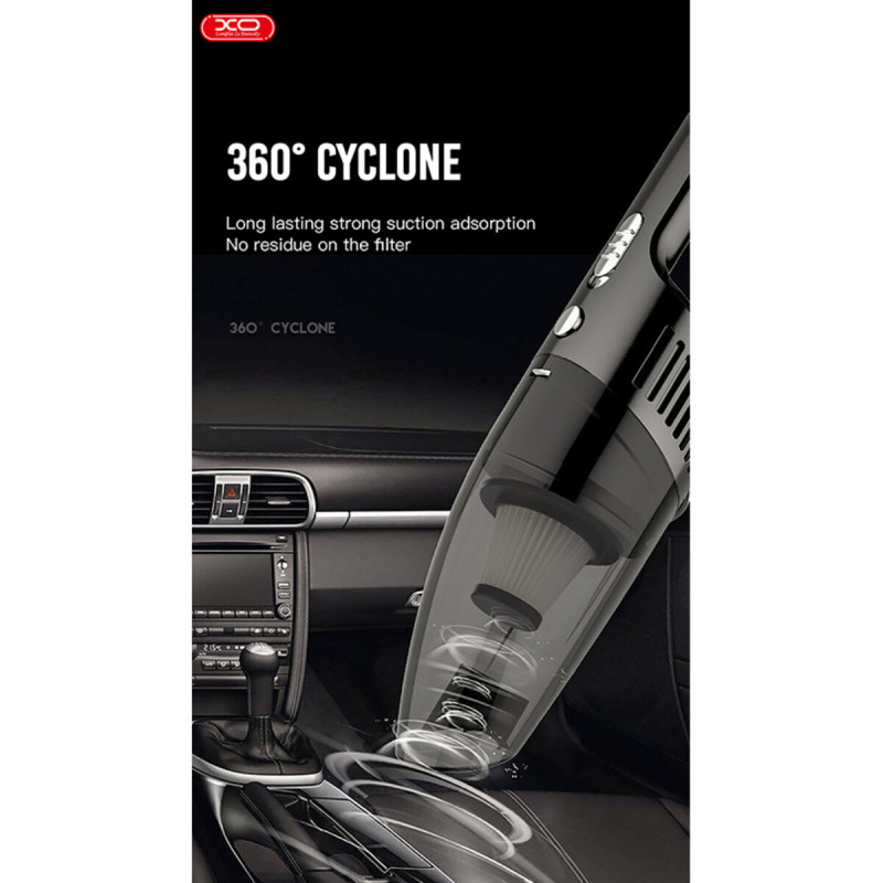 XO CZ001A — компактний автомобільний пилосос із потужним двигуном та високою ефективністю. Ідеально підходить для прибирання салону автомобіля та важкодоступних місць. Оснащений миючим HEPA-фільтром і контейнером на 120 мл, працює від прикурювача.