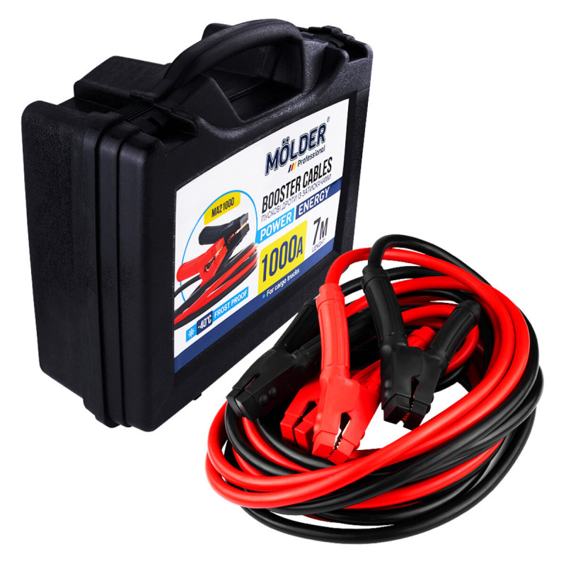 Провода-прикурювачі Molder 1000A, 7 м. Надійні та потужні провода-прикурювачі Molder призначені для запуску автомобіля з розрядженим акумулятором. Витримують струм до 1000А, довжина 7 метрів забезпечує зручність використання навіть у складних умовах. Постачаються у зручній пластиковій упаковці з ручкою для легкого транспортування та зберігання.