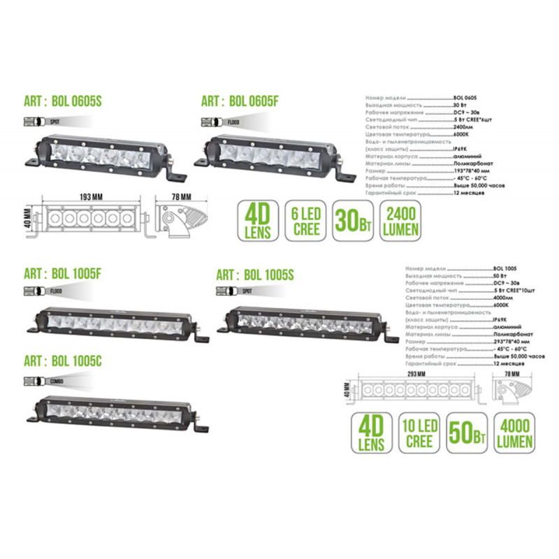 Тип світлового пучка: COMBO-комбінований Вихідна потужність, Вт: 50 Робоча напруга, V: 9-60 Світлодіодний чіп, Вт: 5 (CREE х 10шт) Світловий потік, люмен: 4000 Кольорова температура, К: 6000 Клас захисту: IP69 Матеріал корпуса: алюміній Матеріал лінзи: полікарбонат Колір корпуса: чорний Розмір, мм: 293х78х40 Час роботи, г: 30 000