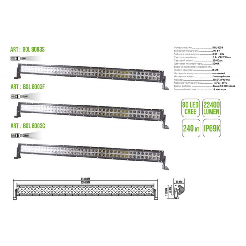 10-30V DC, 240W (80х3W), CREE LEDS, 6000 K, 22400 Lm, Beam Type - Flood, 1050x78x90mm. Алюмінієвий корпус, міцний стальний монтажний кронштейн, водостійкий і пилонепроникний (клас захисту IP69K) Гарантія: 12 місяців