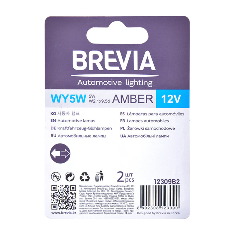Лампа розжарювання Brevia WY5W 12V 5W W2.1x9.5d AMBER B2, 2шт