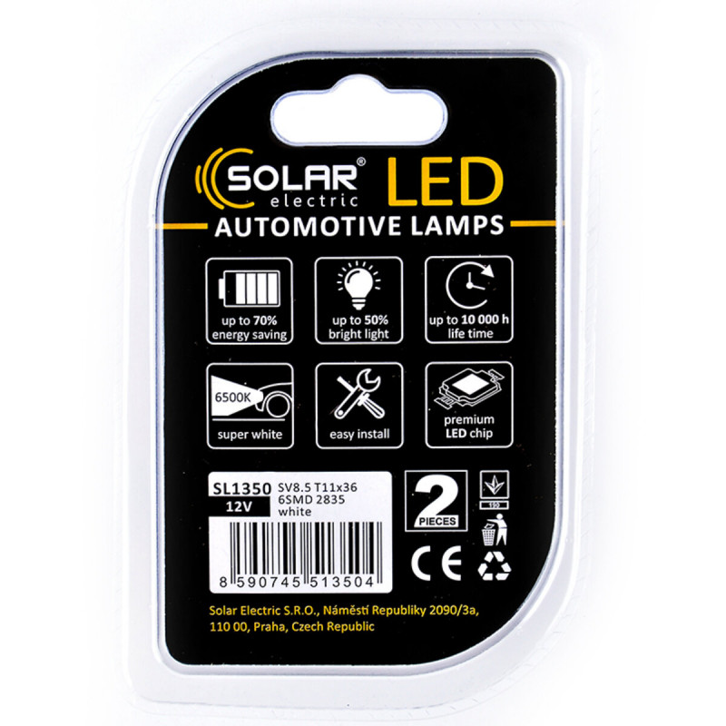 Лампочки SOLAR SV8.5 T11x36 12V 6SMD 2835 white SL1350 (2 шт.) Працюють від напруги бортової мережі 12 Вольт і універсально підходить для легкових автомобілів, мікроавтобусів, позашляховиків, а також мотоциклів. Корпус лампи виконаний з високоякісних матеріалів, завдяки чому відрізняється чудовою стійкістю до вібрацій або ударів, а також володіє прекрасною теплопровідністю і забезпечує ефективне охолодження діодів.