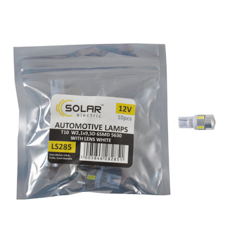 LED автолампа Solar 12V T10 W2.1x9.5d 6SMD 5630 with lens white 10шт