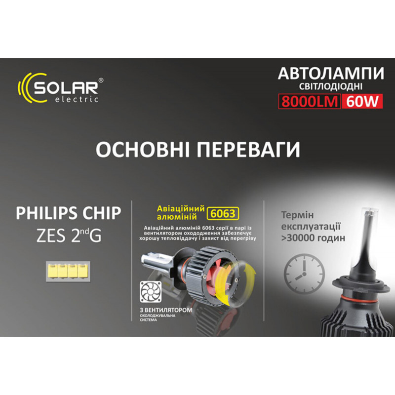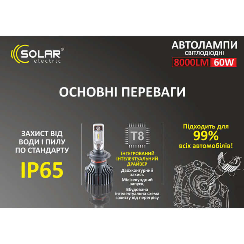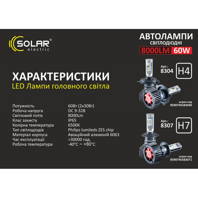 Це супер потужні світлодіодні лампи від бренду SOLAR, у яких випромінюється дуже інтенсивне світло , по яскравості його можна порівняти зі ксеноном. Застосовуються для заміни штатних галогенних ламп. Конструкція у них проста, вібростійка, витримує експлуатацію навіть в екстремальних ситуаціях. Установка не вимагає додаткових навичок електрика, а розмір відповідає стандартам посадочних місць в фарі. Тип цоколя H4/P43t, призначений для установки в поєднану головну оптику, а саме для далекого і ближнього світла.