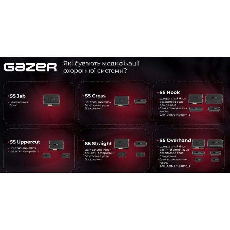 GAZER S5 - Охоронна система, що підходить для встановлення на всі класи автомобілів з бортовою мережею 12В. Система розроблена на сучасних елементних базах провідних виробників електронних компонентів. Збірка і контроль якості проводяться із застосуванням нового і точного обладнання, що гарантує надійність і стабільність роботи системи упродовж усього терміну служби.