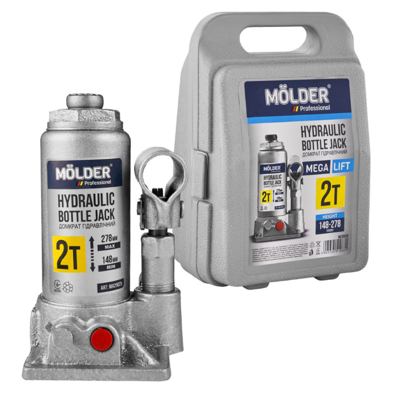 Гідравлічний домкрат Molder – універсальний вантажопідйомний механізм, призначений для підйому, утримання та фіксації автомобіля у процесі проведення ремонтних та діагностичних робіт. Модель пляшкового типу, з максимальною вантажопідйомністю 2 т, що цілком достатньо для легкового автомобіля або мікроавтобуса. Перевагою даного домкрата є хороша висота підйому 278 мм та висота підхоплення 148 мм. Корпус домкрата, у формі пляшки, повністю виконаний із міцного металу. Подовжена металева ручка, складна конструкція, для більш ефективного підняття поршня плунжерного насоса.