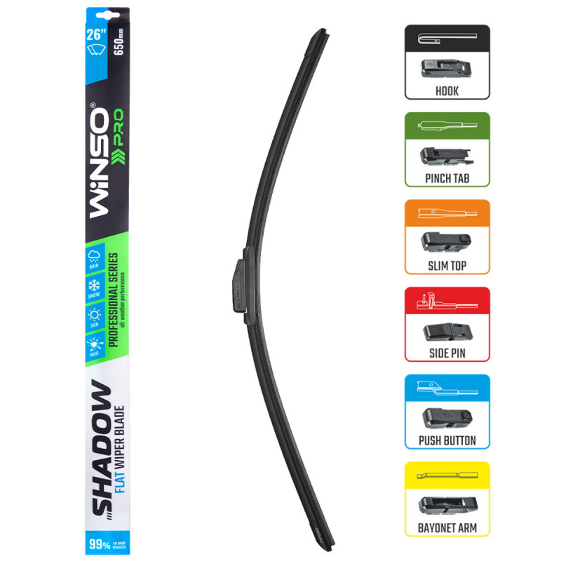 Двірник безкаркасний Winso PRO SHADOW 26/650мм - ідеальне рішення для ефективного очищення скла вашого автомобіля. Із застосуванням сучасних технологій і високоякісних матеріалів, цей двірник забезпечує не тільки відмінне чищення, а й комфорт для водія.