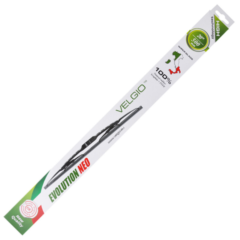 Каркасні склоочисники Velgio EVOLUTION NEO. Шарнірний механізм забезпечує багато точок притиску для якісного очищення вітрового скла. Гумове лезо виготовлено із додаванням натурального каучуку, що розширює діапазон робочої температури від -35C до +65C. Не дряпають скло, працюють безшумно.