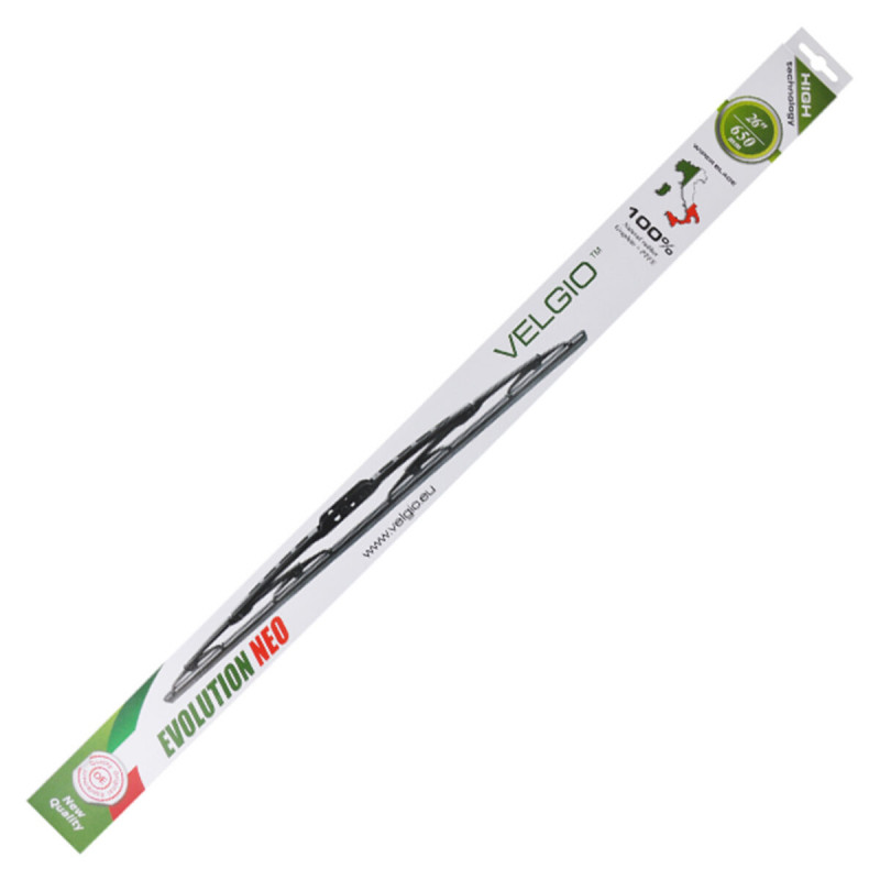 Каркасні склоочисники Velgio EVOLUTION NEO. Шарнірний механізм забезпечує багато точок притиску для якісного очищення вітрового скла. Гумове лезо виготовлено із додаванням натурального каучуку, що розширює діапазон робочої температури від -35C до +65C. Не дряпають скло, працюють безшумно.