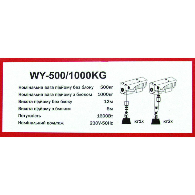 Технічні характеристики електроталі Vulkan WY-500/1000
