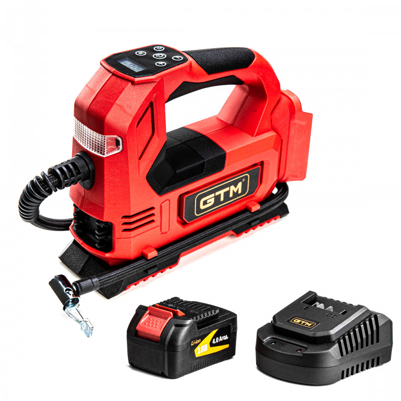 GTM AСC18/26 - компактний і легкий компресор, що призначений для накачування коліс легкових автомобілів або позашляховиків. Це мобільний високопродуктивний компресор без ресивера. Компресор живиться від стандартних акумуляторів GTM 18В або від прикурювача автомобіля. Під час роботи компресор видає 26 л/хв з робочим тиском до 6.8 бара. Компресор поставляється з набором аксесуарів для повноцінної роботи.