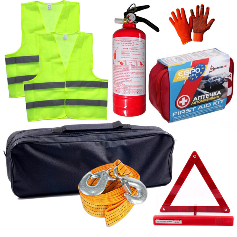 Набір складається: Аптечка медична Євростандарт згідно ТУ, м'який футляр 02-005-M Буксирувальний трос Carlife 4,5т, 5м TR705 Вогнегасник порошковий ВП2 Жилет сигнальний, розмір XXL 2шт. Cумка органайзер велика Тк. чорн. мат., LIDO BX011 Розмір (ШхВхГ): 58 х 18 х 13 см Рукавиці, "Вампірки" Знак аварійної зупинки WT101 Увага! Термін виготовлення сумки від 3 до 4 днів.