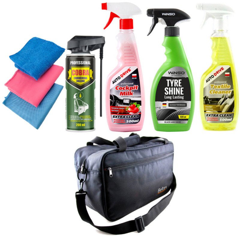 Набір складається: Auto Drive Поліроль-молочко для панелі приладів Cockpit Milk Полуниця, 500мл AD0070 Auto Drive Очисник текстилю Textile Cleaner, 500мл AD0058 Ганчірка з мікрофібри CarLife 30x30 см, набір 3шт (для полірування та скла) CC915 Змазка силіконова Nowax Silicone Spray Professional Cobra, 200мл NX20700 Чорніння для шин Tyre Shine 500мл Сумка органайзер Beltex