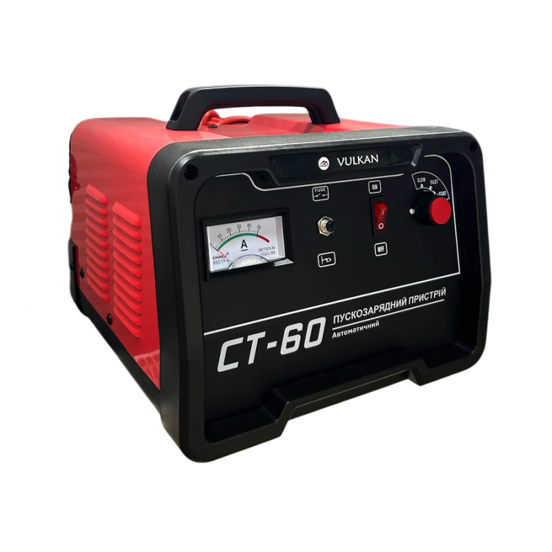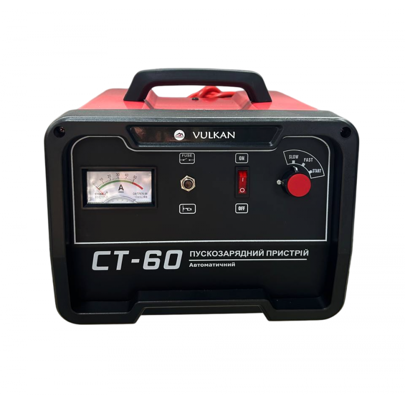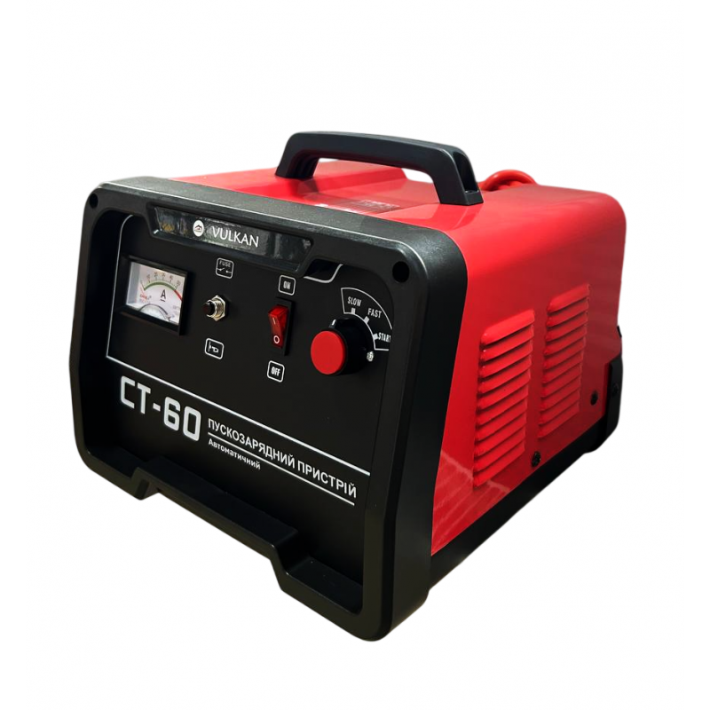 Пускозарядний пристрій Vulkan СТ60 - компактне якісне обладнання для швидкої зарядки автомобільних АКБ, а також пуску разраженной акумуляторів. Пускового струму 150А досить для пуску легкового авто. Працює з акумуляторами на 12В і 24В. Дуже добре підходить для побутового використання.
