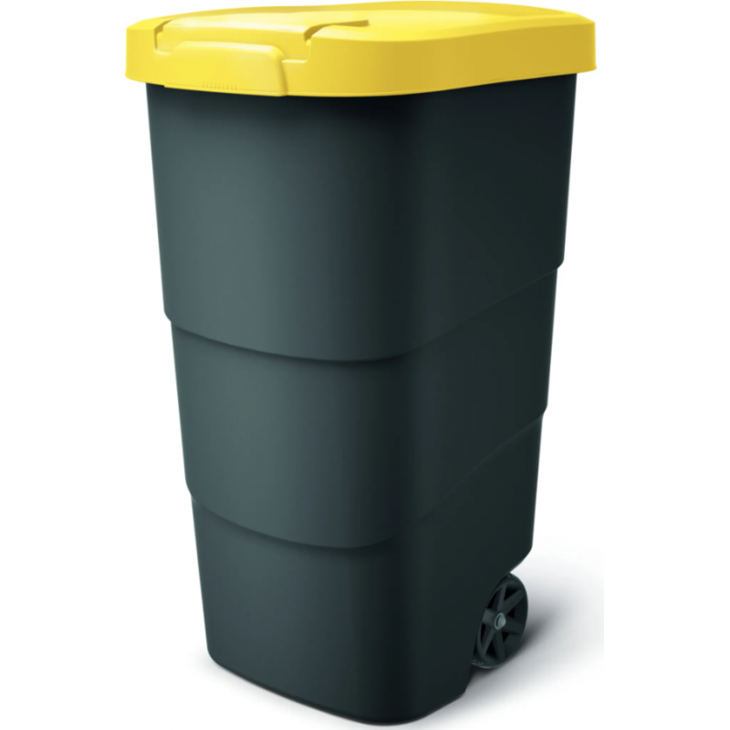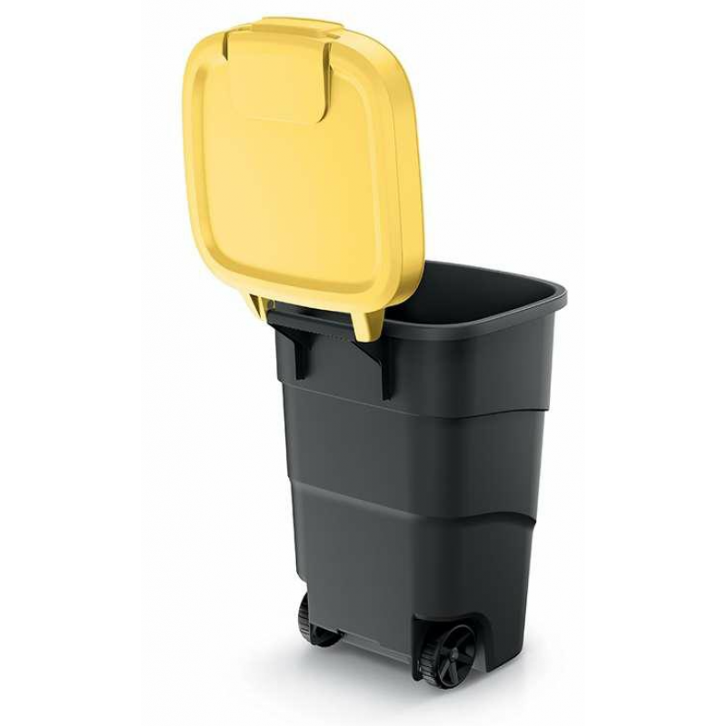 Бак для сміття Prosperplast Wheeler 110 л у стильному кольорі антрацит з жовтою кришкою виготовлений з високоякісного переробленого поліпропілену, що придатний для використання за мінусових температур та стійкий до УФ-випромінювання.