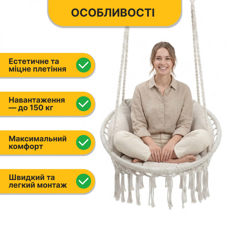 Підвісне плетене крісло-гойдалка LEOBRO Boho Deluxe XL 80 см Cream (LB-1112)