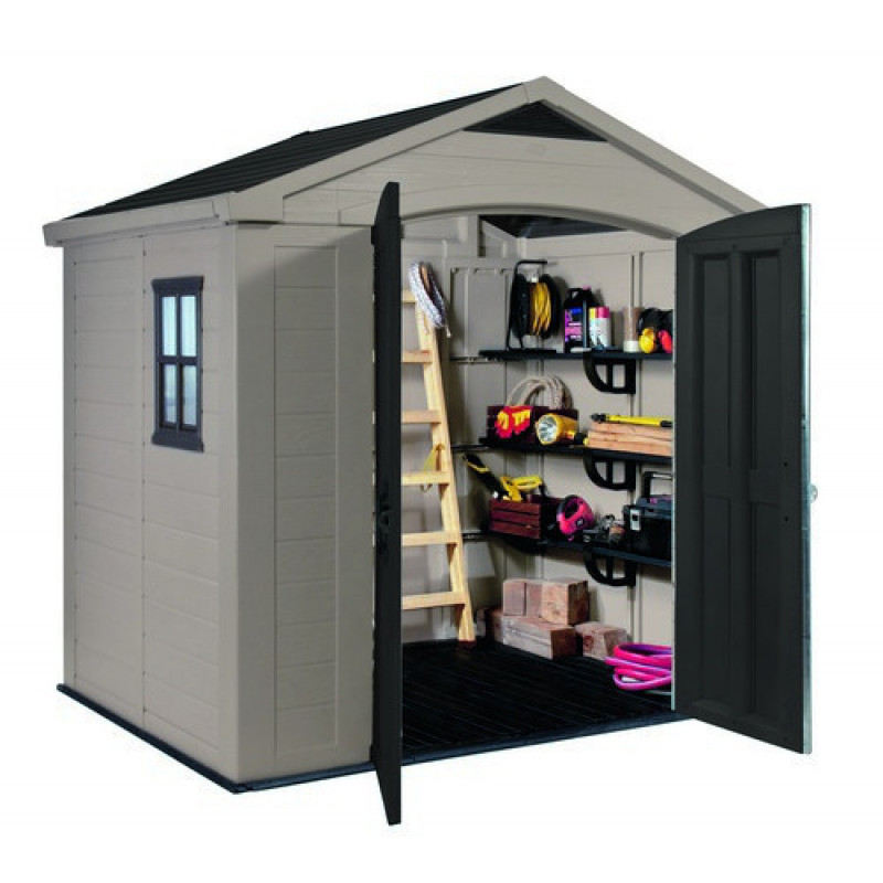 Функціональний будиночок FACTOR 8x6, приведе в захват навіть найвимогливіших користувачів. Посилена сталева конструкція, широкі двопільні двері, додаткове освітлення завдяки вбудованому вікна - безсумнівні переваги цього виробу. Простір усередині будиночку можна максимально оптимально організувати завдяки можливості установки полиць і вішалок. Виріб виготовлено з високоякісного пластика, завдяки чому він не вимагає сервісного обслуговування, не іржавіє, не гниє, а його покриття не лущиться.