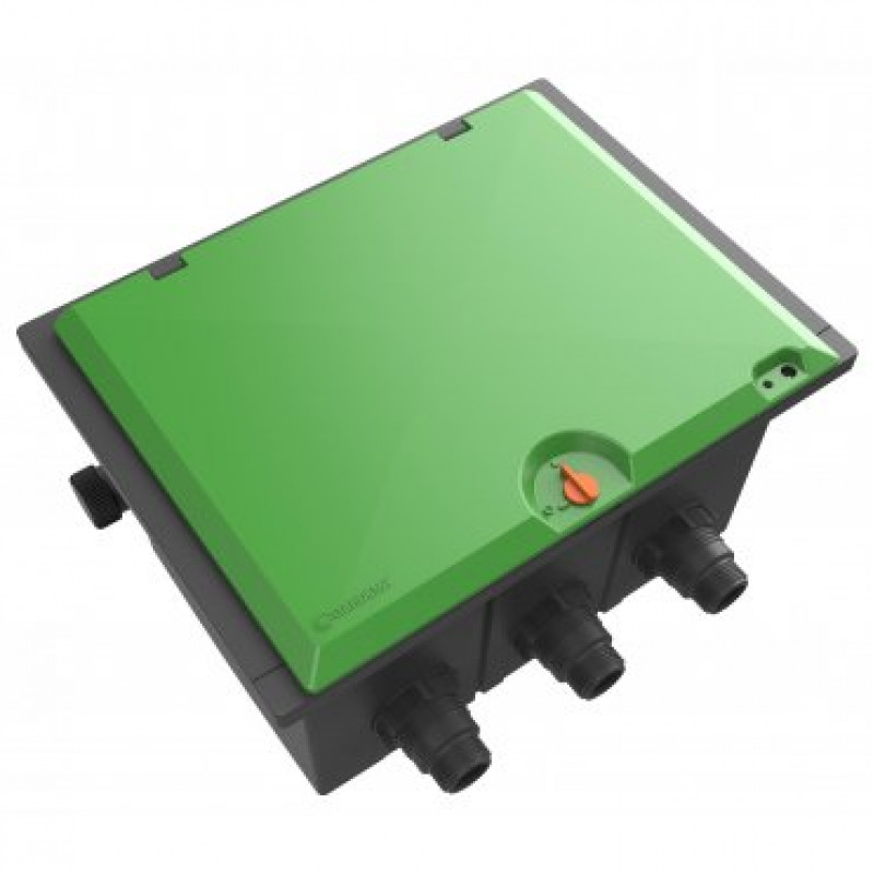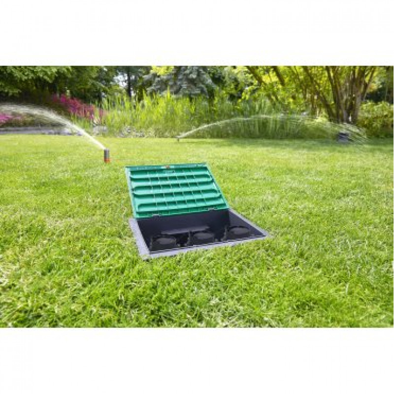 Коробка для клапанів V 3 призначена для підземної установки трьох клапанів для поливу 24 V або трьох клапанів 9 V.Подача води здійснюється з трьох сторін.