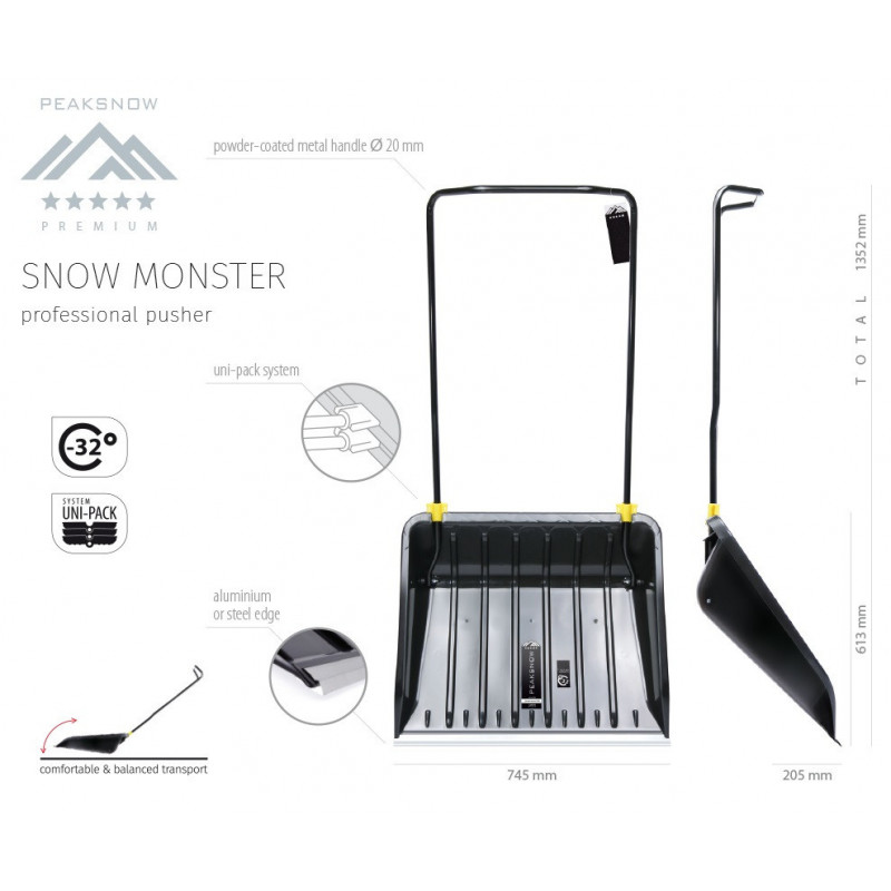 Лопата-скрепер Prosperplast Snow Monster— це міцний та якісний інструмент із широким глибоким ковшем , що забезпечує швидке та зручне прибирання снігу навіть на великих площах. Механізм роботи виробу простий та ефективний — варто лише штовхати лопату перед собою при ходьбі, комфортно переміщаючи масивні об'єми снігу на потрібні відстані. У такий спосіб, економляться не лише час, а й сили користувача, адже не потрібно щоразу відкидати сніг ковшем, як би це було із класичною лопатою.Ківш виготовлений з міцного морозостійкого пластику (до -32°C) та обладнаний алюмінієвим кантом, тому виріб може впоратися навіть із замерзлим і мокрим снігом. Ергономічна форма металевої профільованої ручки гарантує стабільність і високу міцність, а її ширина помістить одночасно дві людини. Ще однією перевагою виробу є особливість конструкції, що дозволяє компактніше скласти лопату, яка займатиме менше простору при зберіганні.Лопата-ківш скрепер Snow Monster ідеально підходить для прибирання снігу з великих територій промислових об'єктів, автостоянок, заправних станцій, офісів і громадських будівель, а також під'їзних шляхів і дворів, де необхідне регулярне очищення снігу.Інвентар для прибирання снігу польського бренду Prosperplast відрізняється високою якістю, міцністю, довговічністю та екологічністю.