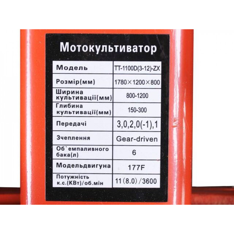 Мотоблок ТТ-1100D(3-12)-ZX (редукторний), двигун 177F (9 л.с.) - бензин, редуктор 3+1, колесо 5*12