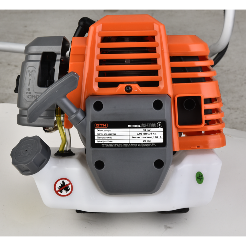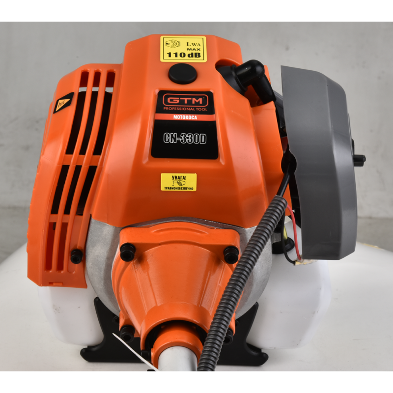 GTM CN330D - бензинова мотокоса (тример) побутового класу, призначена для косіння трави, заростей і кущів діаметром до 20 мм на дачі, садовій ділянці або сільській місцевості. Коса оснащена 2-тактним бензиновим двигуном потужністю 1.05 кВт (1,4 к. с.) з підвищеним крутним моментом. Як паливо використовується суміш бензину з мастилом у пропорції 40:1 (25 мл мастила на 1 л бензину).