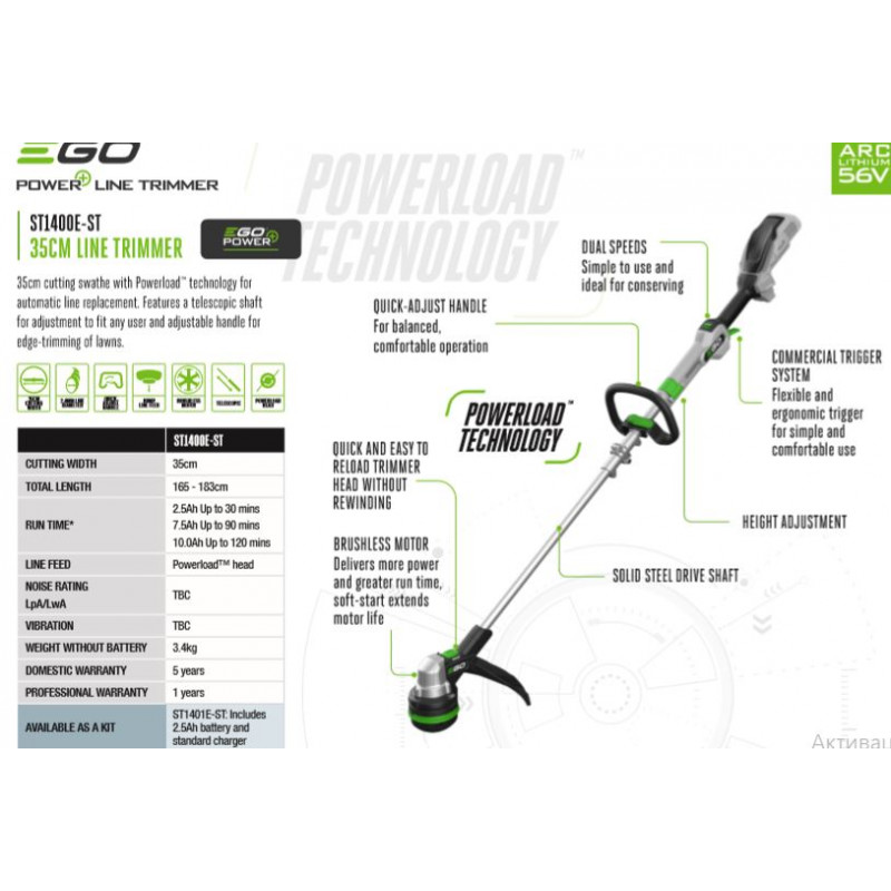 EGO ST1400E-ST - потужний та надійний інструмент, розроблений для догляду за газонами невеликої площі. Ширина захоплення при роботі становить 35 см, чого більш ніж достатньо для побутового використання. Високу потужність та продуктивність тримера забезпечує безщітковий двигун, який живиться від Li-ion акумуляторів EGO 56V. Тример має 2 робочі швидкості, тому здатний впоратися також з бур'янами на ділянці. Завдяки високій ефективності двигуна, однієї батареї на 2.5 А * год вистачає на 30 хвилин безперервної роботи. Відмінністю даної моделі тримера від іншої лінійки EGO є особлива конструкція штанги, довжина якої регулюється під зростання користувача, а також при транспортуванні її можна скласти, що значно економить місце.