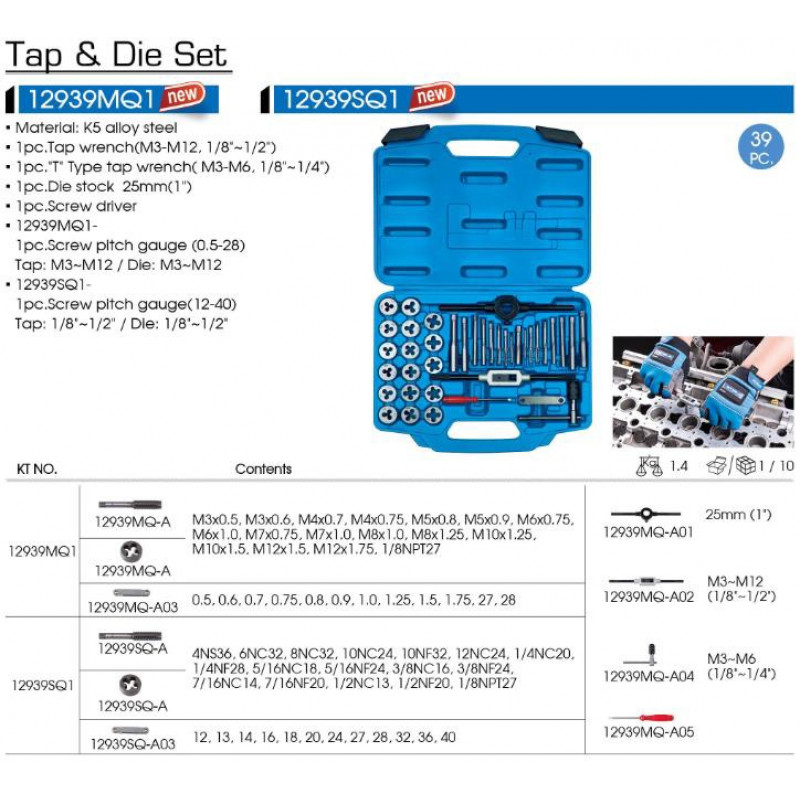 16 плашок - М3х0,5, М3х0,6, М4х0,7, М4х0,75, М5х0,8, М5х0,9, М6х0,75, М6х1,0, М7х0,75, М7х1,0, М8х1,0, М8х1,25 , М10х1, 25, М10х1, 5, М12х1, 5, М12х1, 75 16 мітчиків - М3х0,5, М3х0,6, М4х0,7, М4х0,75, М5х0,8, М5х0,9, М6х0,75, М6х1,0, М7х0,75, М7х1,0, М8х1,0, М8х1,25 , М10х1, 25, М10х1, 5, М12х1, 5, М12х1, 75 2 - різьбоміра 1/8-27 1 - комір для мітчика 1 - комір для плашок Набір мітчиків та плашок King Tony 12939MQ1 - професійний комплект для нарізування різьблення, який включає 39 предметів, для роботи вдома, в майстерні або СТО. У набір входять мітчики та плашки з метричним різьбленням від M3 до M12, а також комірки для зручної роботи з ними. Комплект поставляється в захисному кейсі з міцного пластику і надійними замками.